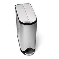 The lid opens by stepping on the solid-steel platform pedal--convenient for when your hands are full or you want to keep them clean and germ-free. Other highlights include an integrated toe kick for easier access to the pedal, a fingerprint-proof finish that decreases smudges and keeps the steel looking shiny and new, and a non-skid base. In addition, the can offers a dent-proof plastic inner bucket and a smartbucket bag-change system that eliminates messy bag overhang and makes it easier to take out the trash. This trash can measures 23-5/16 by 10-2/5 by 26-5/16 inches and has a 30-1/2-inch height with the lid opened. It is designed to be used with standard trash bags (13-gallon size) or simplehuman can liners (size K) for a perfect fit. Backed by a 10-year warranty.